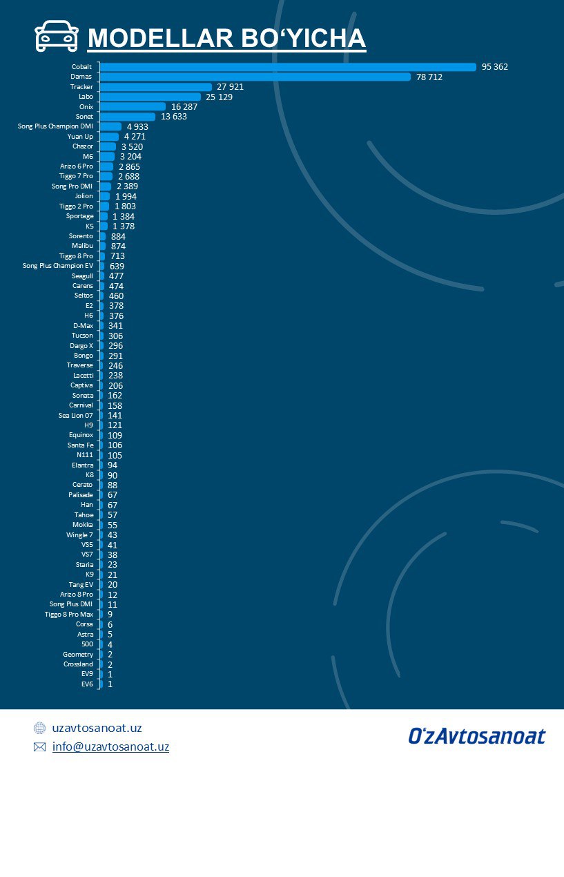 Eng ko‘p sotilgan avtomobil – Cobalt. Hisobot davrida 95 362 dona ushbu modeldagi avtomobil sotilgan.