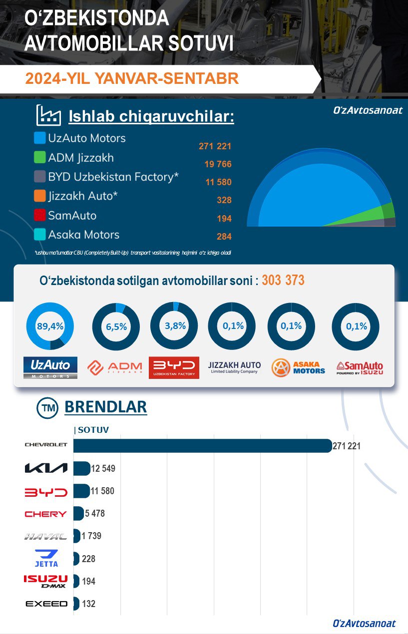 Qayd etilishicha, hisobot davrida UzAuto Motors 141 304 dona, Khorezm Auto 103 837 dona, ADM Jizzakh 32 987 dona, BYD Uzbekistan Factory 16 846 dona, Asaka Motors 937 dona, SamAuto 341 dona, Alyans Auto 79 dona avtomobilni xaridorlarga yetkazib bergan. Taqqoslash uchun, 2024 yilning yanvar-sentabr oylarida Shevrolet brendi ostidagi 303 373 dona mashina sotilgan. Bu joriy yildagi sotuv miqdoridan ham 26 mingtaga ko‘p.