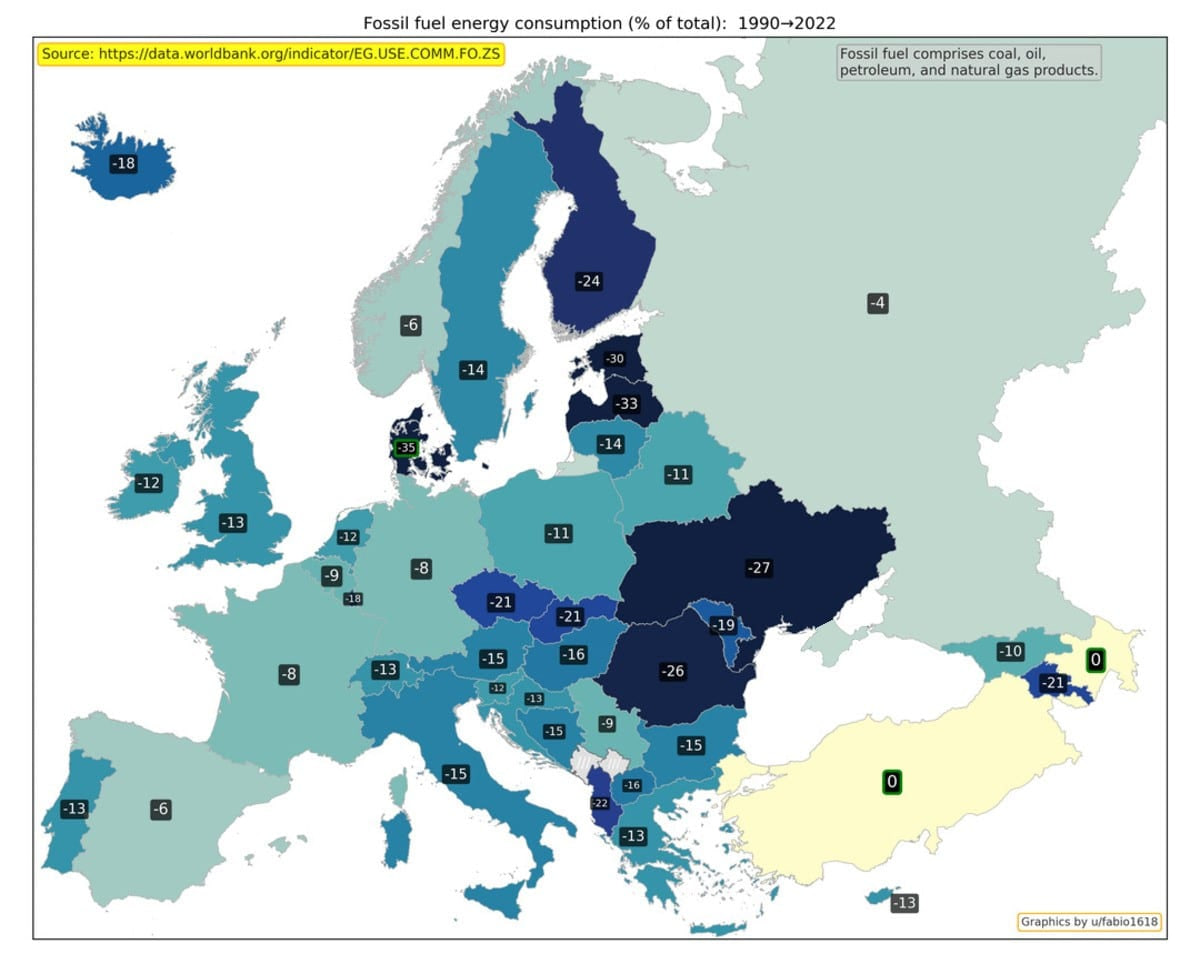 Qazib olinadigan yonilg‘i energiyasi iste’moli iste’mol qilinadigan umumiy energiyaning qancha qismini ko‘mir, neft, neft mahsulotlari va tabiiy gazdan tashkil etishini ko‘rsatadi. Bu ko‘rsatkich Daniya, Latviya va Estoniyada eng ko‘p pasaygan.