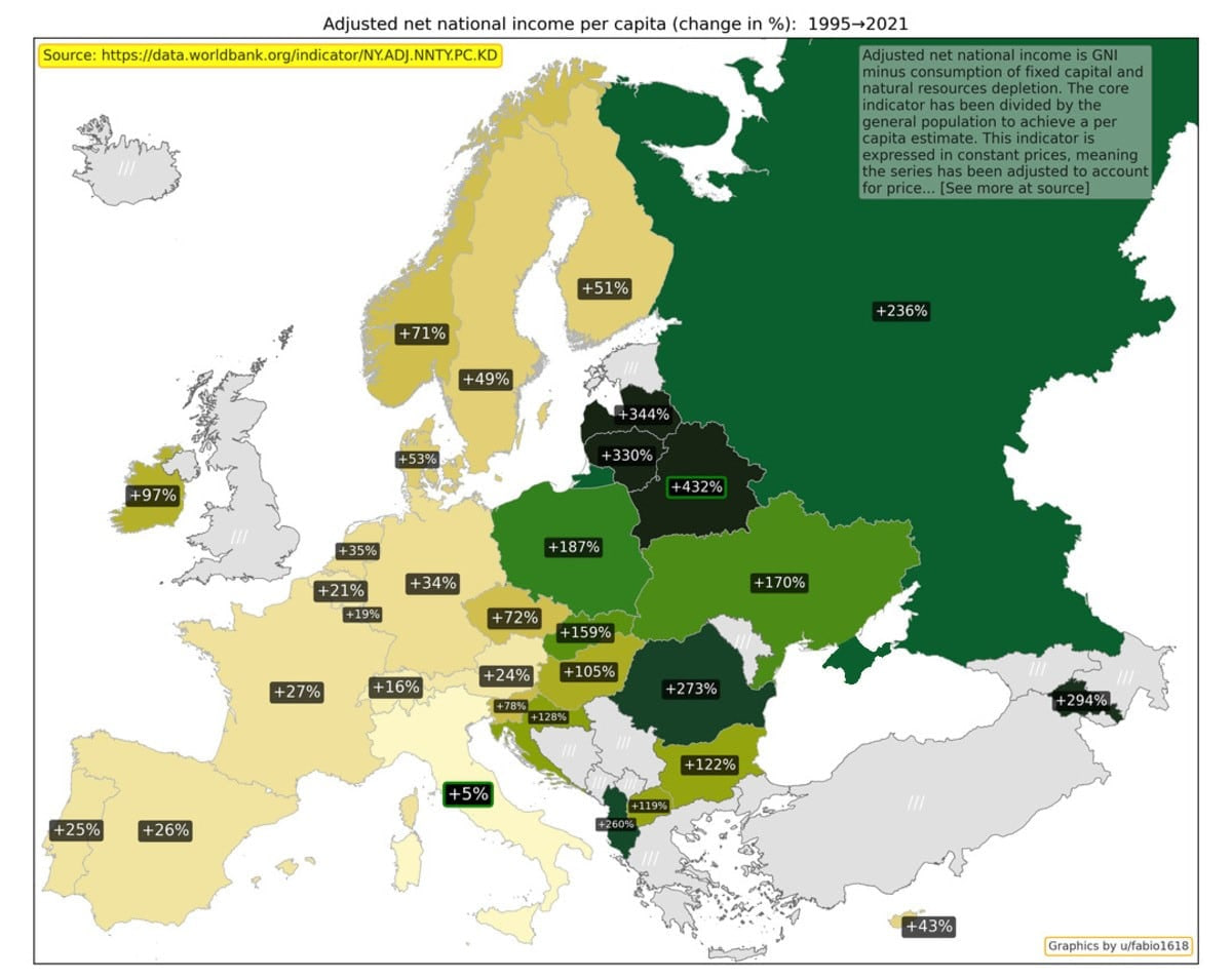 Aholi jon boshiga to‘g‘rilangan sof milliy daromad mamlakat farovonligining yana bir muhim ko‘rsatkichidir. Boltiqbo‘yi mamlakatlari — Litva, Estoniya va Latviya — eng katta o‘sishga ega.