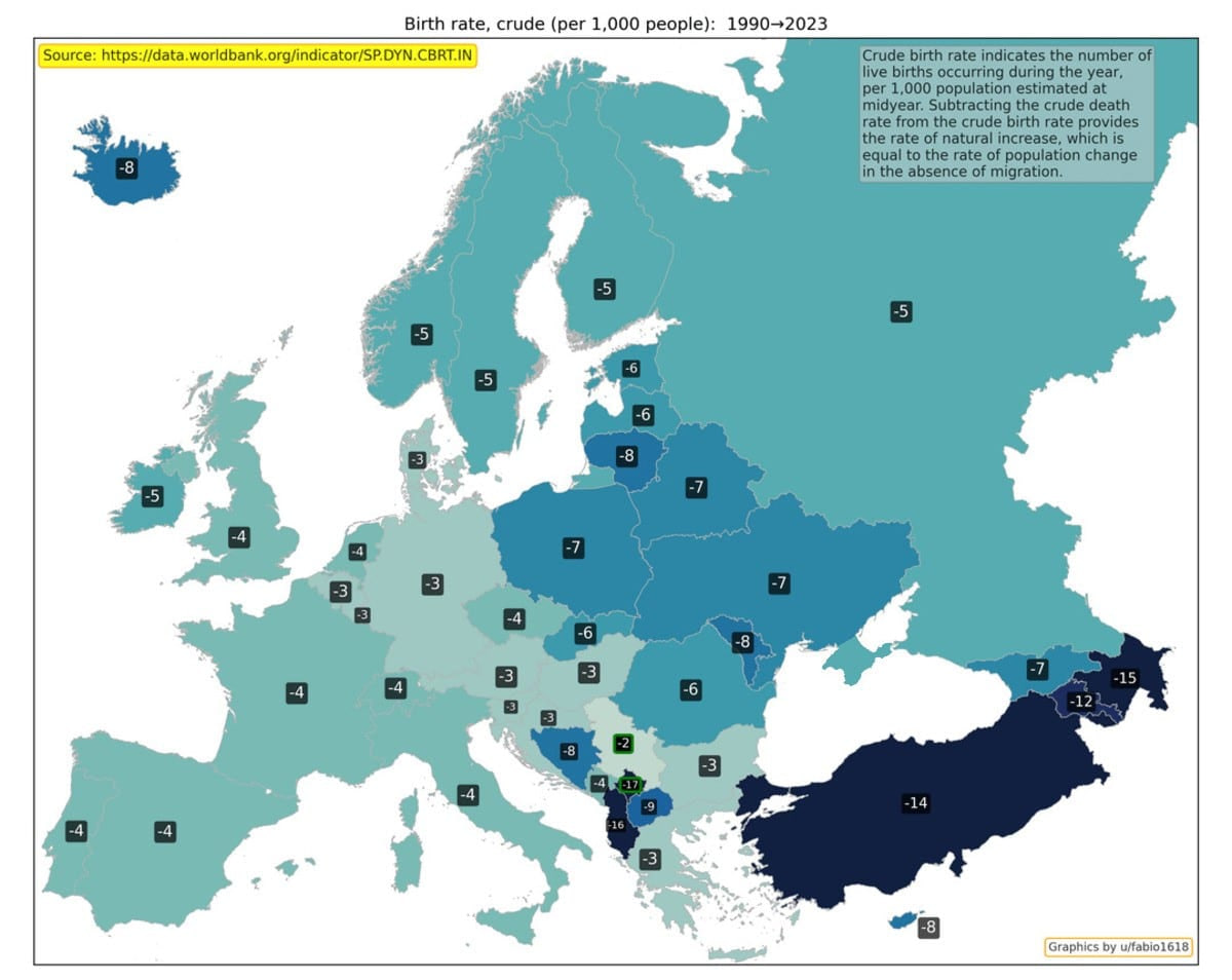 Barcha Yevropa mamlakatlarida tug‘ilish kamaydi. Ming kishiga tug‘ilish darajasi Albaniya, Kosovo va Ozarboyjonda eng ko‘p pasaygan.