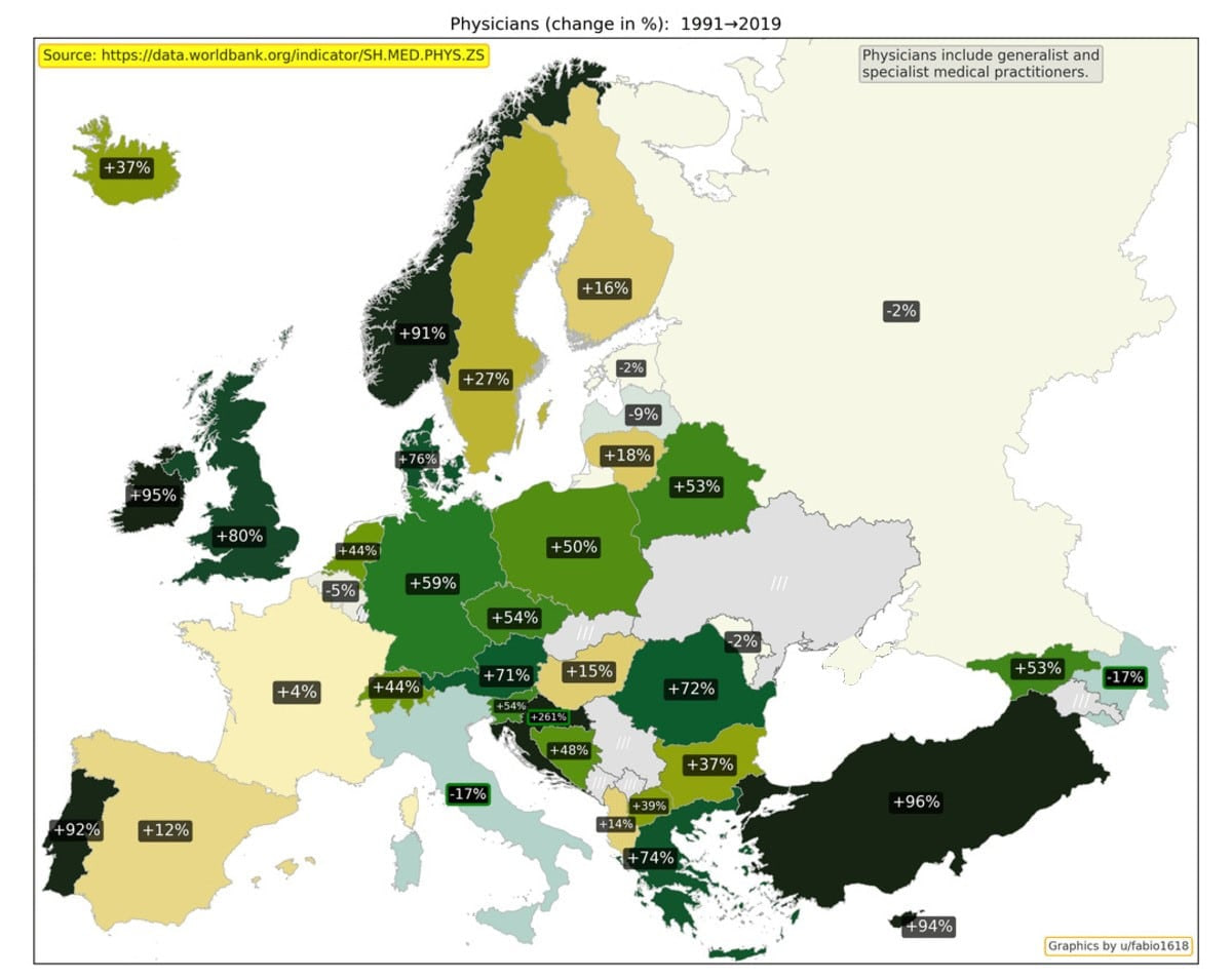 Shifokorlar sonining o‘zgarishi sog‘liqni saqlashdan foydalanish imkoniyatlari qanday o‘zgarib borayotganini ko‘rsatadi. Ushbu ko‘rsatkich umumiy amaliyot shifokorlari va mutaxassislarni o‘z ichiga oladi. Eng katta o‘sish Xorvatiya, Turkiya va Irlandiyada kuzatildi.