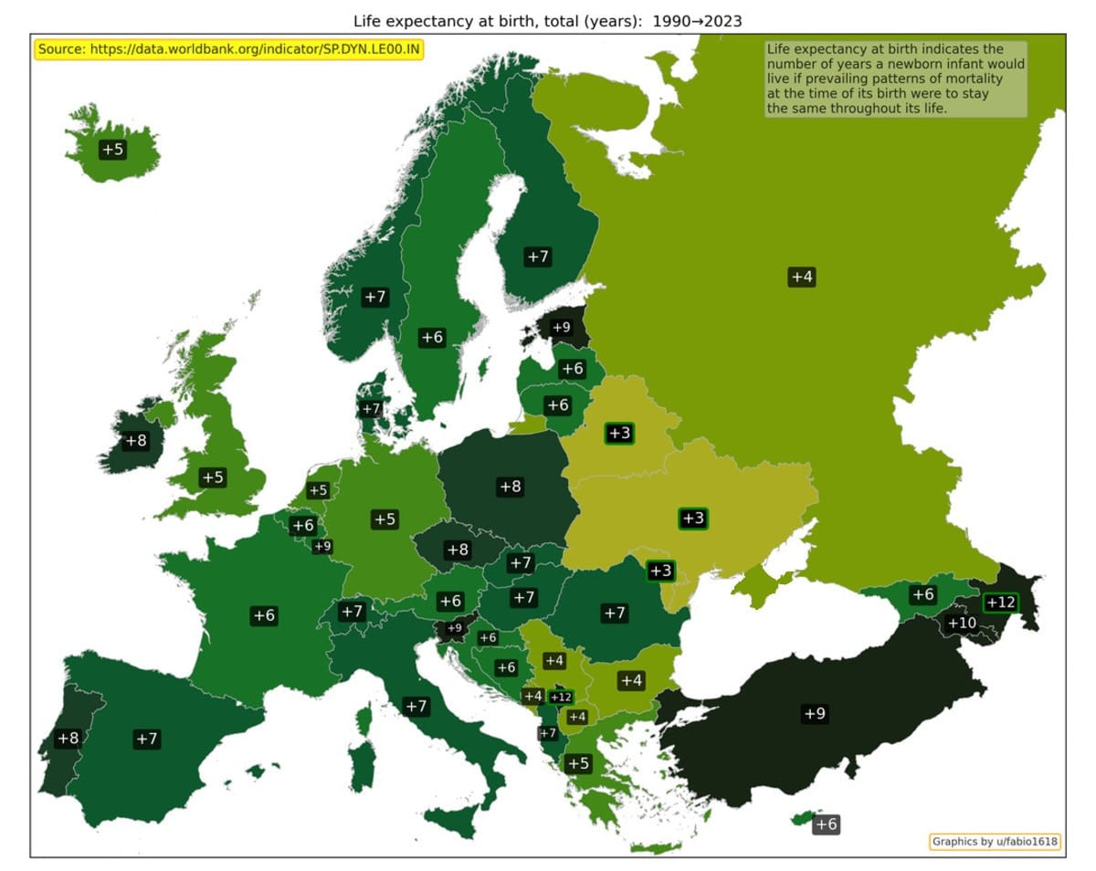 Tug‘ilganda kutilayotgan umr ko‘rish, agar hozirgi o‘lim darajasi o‘zgarmagan bo‘lsa, yangi tug‘ilgan chaqaloq o‘rtacha qancha yashashini ko‘rsatadi. Bu ko‘rsatkich Ozarboyjon, Armaniston, Turkiya va Estoniyada eng ko‘p oshgan.