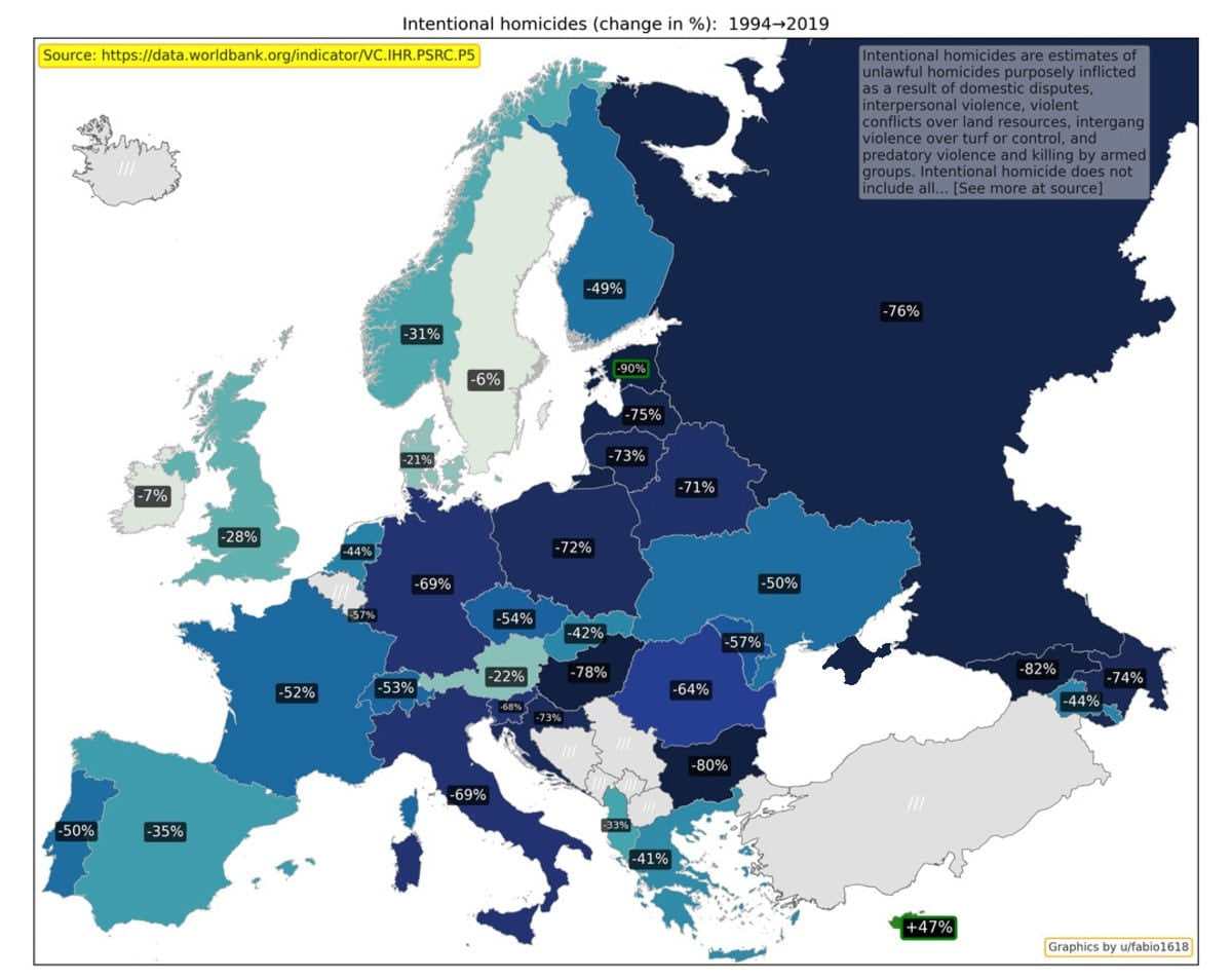 «Qasddan odam o‘ldirish» indikatoriga ehtiyotsizlik yoki o‘zini himoya qilish maqsadida sodir etilgan qotilliklar kirmaydi. 1994 yildan 2019 yilgacha odam o‘ldirish darajasi Estoniya, Gurjiston va Bolgariyada eng ko‘p kamaydi.