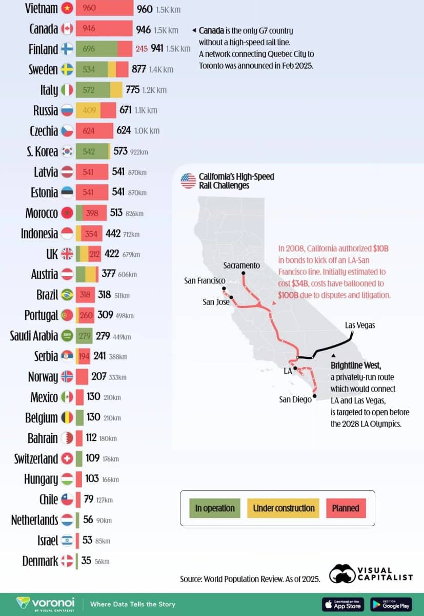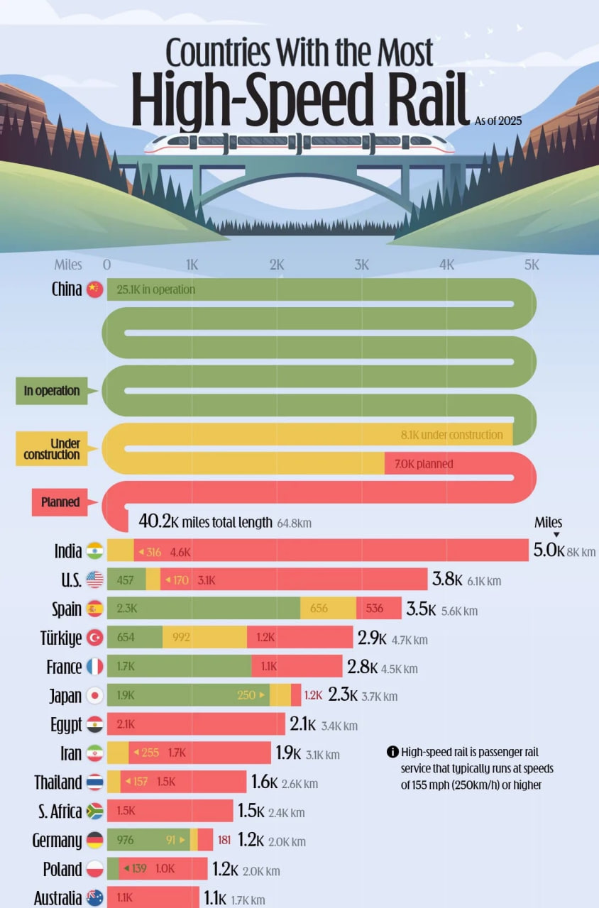 Ushbu infografikada 2025 yilga kelib eng uzun tezyurar temiryo‘l liniyalariga ega bo‘lgan mamlakatlar mavjud liniyalar, qurilayotgan yo‘llar va rejalashtirilgan liniyalarga bo‘lingan holda ko‘rsatilgan. Vizualizatsiya uchun ma’lumotlar World Population Review portali tomonidan to‘plangan.