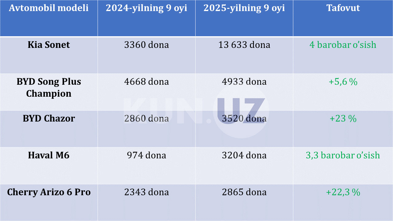2025 yilning 9 oyida UzAuto Motors tomonidan taqdim etilayotgan 10 ta modeldan 7 tasining sotuvlari kamaygan. Hisobot davrida Chevrolet brendiga tegishli bo‘lmagan va eng ko‘p sotilgan avtomobil – Kia Sonet. BYD ham umumiy sotuvlardagi ulushini 3,8 foizdan 5,7 foizgacha oshirgan.