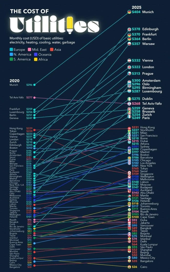 Deutsche Bank ma’lumotlariga asoslangan ushbu infografikada butun dunyo bo‘ylab kommunal xizmatlarning o‘rtacha narxi ko‘rsatilgan. Germaniyaning Myunxen shahri oylik 404 dollar (4 mln 900 ming so‘mdan ortiq) to‘lov bilan birinchi o‘rinda turadi.