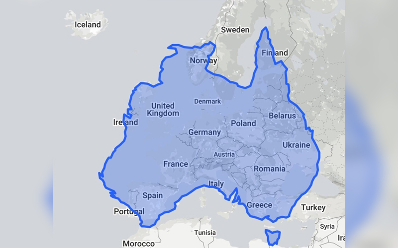 Avstraliya va Yevropa turli tarixga, iqlimga va tabiiy muhitga ega mintaqalardir, ammo ularning hududiy kattaligi va aholisini o‘zaro solishtirish qiziq natijani keltirib chiqardi. Ushbu infografikada nisbiy o‘lchamlar aniq ko‘rsatilgan.