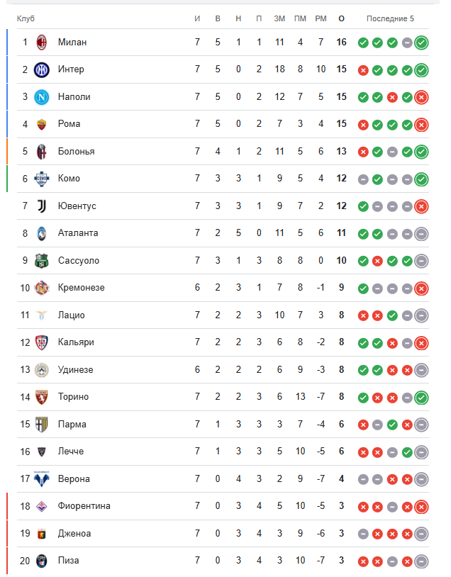 Shanba kungi o‘yinlar natijalariga ko‘ra A Seriyada turnir jadvalining yuqori qismida «Inter», «Napoli» va «Roma» bir xil ochko to‘plab, triumvirat hosil qilishdi. Bir kun o‘tib ularning safiga «Yuventus» qo‘shilishi mumkin edi, ammo turinliklar Arsen Venger, Tiyerri Anri va Rafael Varan tribunadan o‘tirib kuzatgan o‘yinda «Komo»ga yutqazdi va ushbu jamoani o‘zidan oldinga o‘tkazib yubordi.