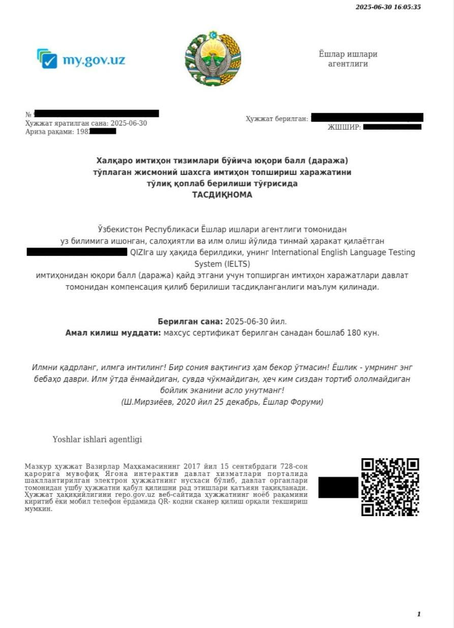 Men, Asal Ravshanova, shu yil iyunda IELTS topshirdim va 7.0 ball oldim. my.gov.uz portali orqali kompensatsiya uchun ariza berdim va uch hafta ichida to‘lovni oldim. Aslida bu jarayon unchalik murakkab emas, lekin ba’zi nozik jihatlarni oldindan bilib olgan yaxshi.