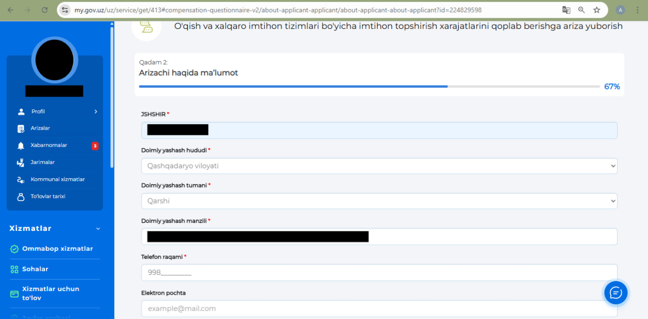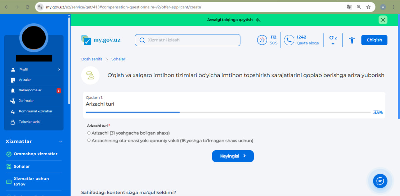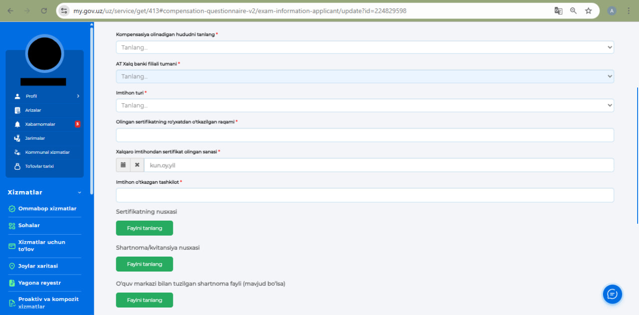 my.gov.uz portalidagi «Ta’lim va xalqaro imtihonlar uchun xarajatlarni qoplash» xizmatini tanlagandan so‘ng, foydalanuvchi anketa to‘ldirishi kerak bo‘ladi.