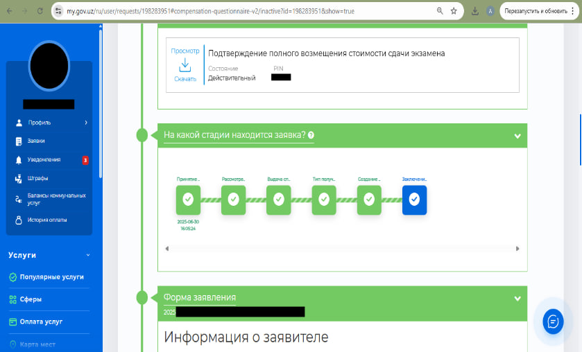 Ariza tasdiqlangandan so‘ng foydalanuvchi SMS-xabarnoma oladi, my.gov.uz shaxsiy kabinetida esa kompensatsiya olish huquqini tasdiqlovchi hujjat paydo bo‘ladi.