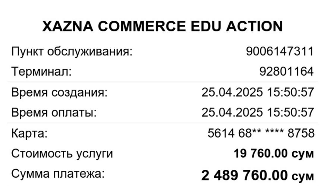 - Imtihon uchun to‘lov qilinganligi haqidagi kvitansiya.