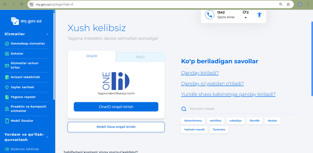 OneID — bu aksariyat onlayn davlat xizmatlari uchun standart avtorizatsiya usuli;
