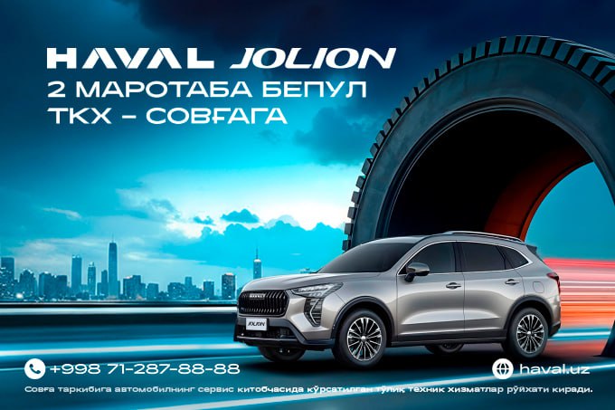 Endi zamonaviy HAVAL Jolion shahar krossoverini xarid qilganingizda, siz ikki marotaba rejali hisoblangan texnik xizmat ko‘rsatishga* mutlaqo bepul ega bo‘lasiz. Mazkur xizmatni HAVAL Uzbekistanʼning barcha rasmiy dilerlik markazlarida olish mumkin bo‘ladi.