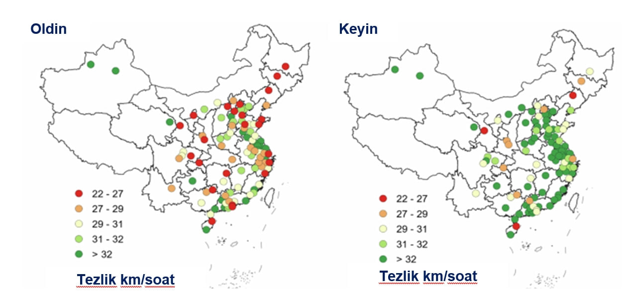 Shanxayda tig‘iz vaqtlarda harakat tezligining o‘zgarishi (SI asosidagi harakatni boshqarish texnologiyalari joriy etilishidan oldin va keyin)