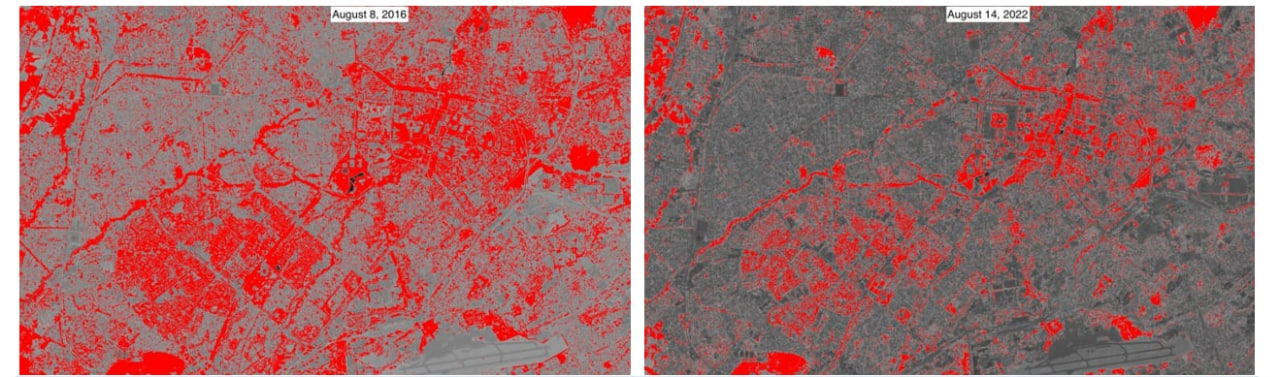 Shuni ta’kidlash kerakki, nazoratsiz qurilish va yashil maydonlarning qisqarishi shaharning chang va issiqlik orollari bilan kurashish qobiliyatini pasaytiradi. Sun’iy yo‘ldoshdan olingan NDVI (o‘simlik qoplami farqlarining standartlashtirilgan indeksi) suratlariga ko‘ra, atigi olti yil ichida shahardagi o‘simlik qoplami maydoni 34,6 foizdan 13,1 foizga kamaygan. Shu bilan birga, xalqaro standartlarga ko‘ra, shahardagi yashil maydonlarning minimal me’yori hududning kamida 25 foizini yoki bitta yashovchiga 9 kvadrat metr yashil hududni tashkil etishi kerak.