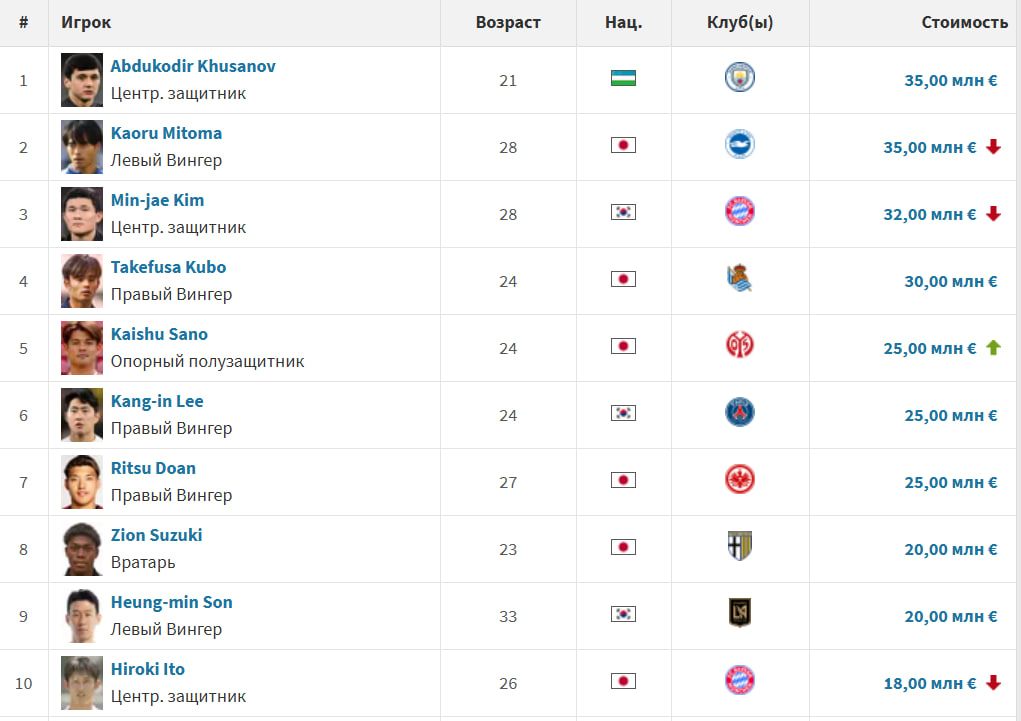 Reytingda O‘zbekiston milliy jamoasi va Angliyaning «Manchester Siti» klubi himoyachisi Abduqodir Husanov Osiyo qit’asining eng qimmat futbolchisiga aylandi. Uning transfer narxi 35 mln yevroga baholangan.
