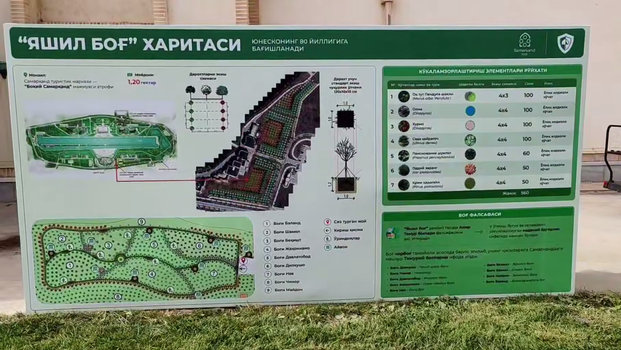 Samarqandda Amir Temur bog‘lari an’anasi zamonaviy talqinda qayta tiklanmoqda. 5 gektar maydonda YuNeSKO tashkil etilganining 80 yilligi munosabati bilan “Merosga tayanab, kelajak sari” shiori ostida “Yashil bog‘” barpo etildi. Loyiha tashkilotning asosiy qadriyatlari - tinchlik, madaniyatlararo muloqot, madaniy merosni asrash va ekologik barqarorlik g‘oyalarini ifoda etadi.