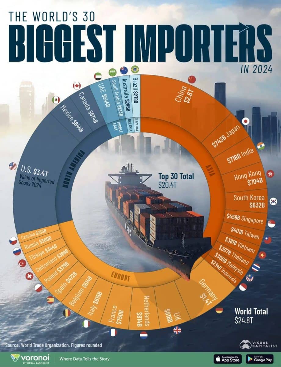 Jahon savdo tashkiloti ma’lumotlariga asoslangan ushbu infografika sayyoradagi eng yirik tovar import qiluvchilarini yaqqol namoyish etadi.