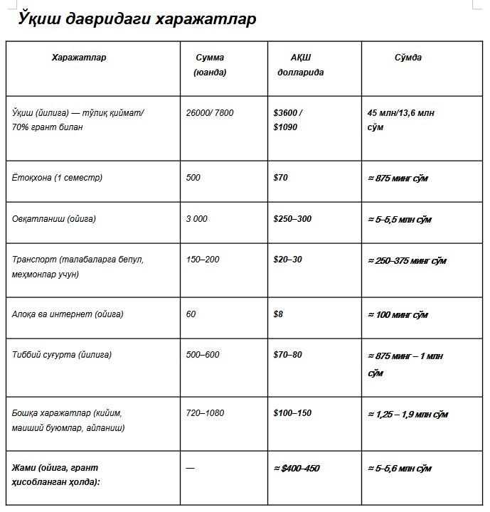 Universitetda o‘qishning to‘liq qiymati yiliga 26 000 yuanni tashkil qiladi (taxminan 3 600 dollar). Men qiymatning 70% ini qoplaydigan grant asosida o‘qiyman, shuning uchun faqat 30%i — yiliga 7 800 yuan (1 092 dollar) to‘layman.