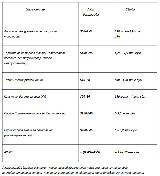 Xitoyda o‘qishga ketadigan xarajatlar (agentlik xizmatisiz)
