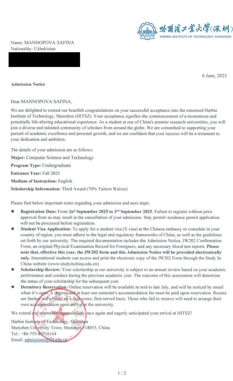 Ariza topshirilgandan bir oy o‘tgach, matematika va fizikadan kirish imtihonini topshirish kerak edi. Men Xitoyning yetakchi texnik universitetlaridan biri bo‘lgan Harbin Institute of Technology (Shenzhen campus)ni tanladim. Yo‘nalishim — Computer Science and Technology: ITni shunchaki amaliy dasturlash sifatida emas, chuqurroq, injyenerlik yo‘nalishida o‘rganishni istardim.