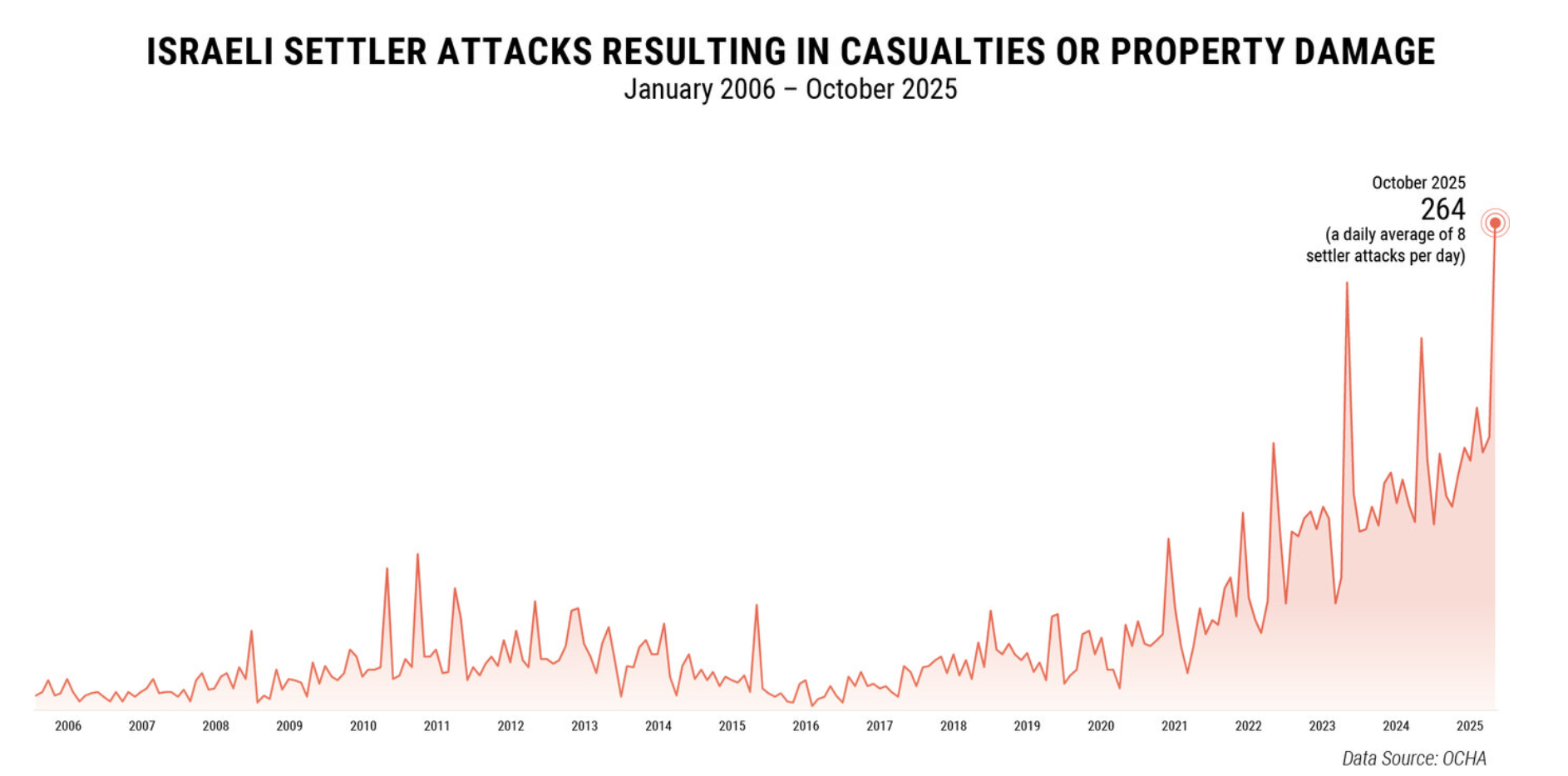 7 noyabr kuni BMT e’lon qilgan hisobotga ko‘ra, isroillik ko‘chmanchilar oktyabr oyida G‘arbiy sohilda falastinliklarga qarshi kamida 264 ta hujum sodir etgan. Bu 2006 yilda, BMT bunday holatlarni kuzata boshlaganidan beri eng yuqori oylik ko‘rsatkich hisoblanadi.