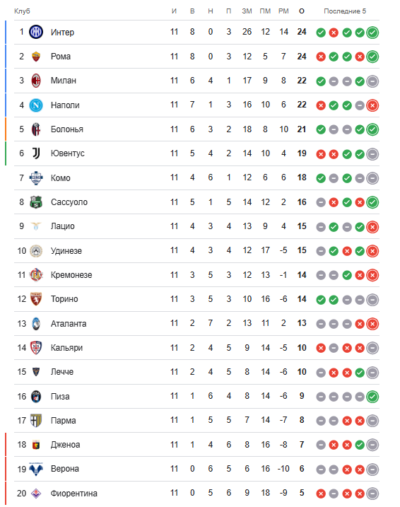 Kun oxirida esa «Roma» ham peshqadamlikni boy berdi, endi xalqaro tanaffus yakunigacha «Inter» birinchi o‘rinda qoladi. Neradzurrilar «Roma»ni qo‘shimcha ko‘rsatkichlar hisobiga quvib o‘tdi. Faqat YeChLda gol urayotgan Lautaro Martines esa ichki chempionatda uch o‘yinlik quruq seriyasini yakunlab, tezkor gol bilan hisobni ochdi. Ikkinchi bo‘lim boshida esa Dimarko yosh hujumchi Bonnini ideal uzatma bilan ta’minladi va hisobdagi farq oshirildi.