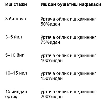 Agar kompaniyada shtat qisqarsa, sizga ishdan bo‘shatish nafaqasi to‘lanishi kerak (MK 173-modda). Uning miqdori ish stajiga bog‘liq: