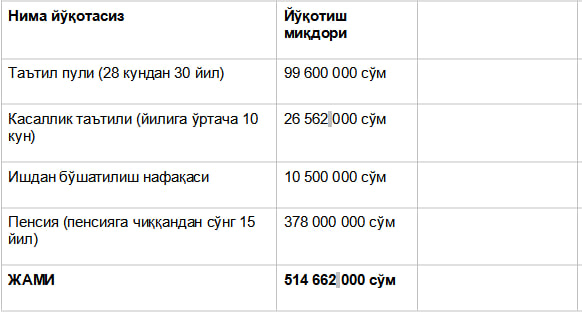 Misol: Siz 8 yil ishladingiz. Rasmiy maoshingiz — 1,5 mln so‘m, real maosh — 5 mln so‘m. Ishdan bo‘shatilganingizda olishni mo‘ljallayapsiz:
