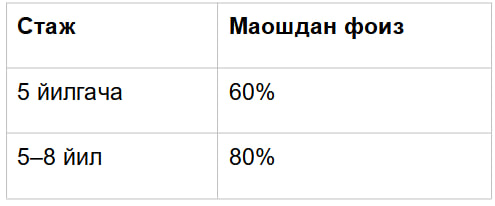 Misol: Siz 30 yil ishladingiz. Bu davr mobaynidagi rasmiy maoshingiz – 1,5 mln so‘m. Real maoshingiz – 5 mln so‘m.