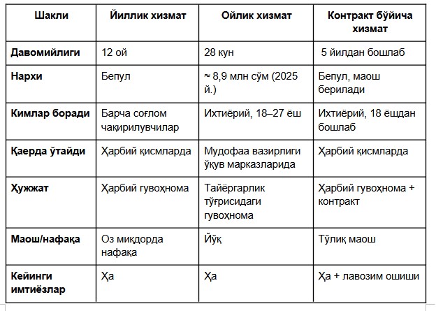 O‘zbekistonda harbiy xizmat tizimi bosqichma-bosqich o‘zgarib bormoqda. Hozirda chaqiriluvchilarda tanlov bor: bir yillik to‘liq harbiy xizmatni o‘tash, pul evaziga bir oylik tayyorgarlikdan o‘tish yoki shartnoma asosida xizmat qilish. Ular o‘rtasidagi tafovutlar va rejaga qarab qaysi birini tanlash haqida fikr yuritamiz.