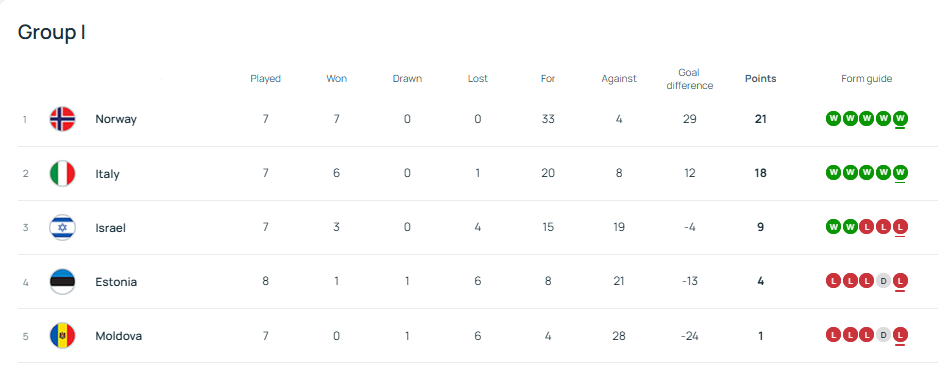 Bu g‘alabadan keyin skandinavlar amalda JCh-2026 yo‘llanmasini hal qilishdi. So‘nggi tur oldidan Stol Solbakken shogirdlari 21 ochko to‘plagan va Italiyadan uch ochkoga oldinda. Ammo Norvegiya to‘plar nisbati bo‘yicha katta farq hosil qilgan («+12»ga qarshi «+29»), natijada so‘nggi turda italyanlarga mag‘lub bo‘lish ham amalda hech narsani o‘zgartirmaydi, vaziyat o‘zgarishi uchun Norvegiya yakshanba kuni Italiyada 9 ta javobsiz gol o‘tkazishi kerak bo‘ladi. Shunday ekan, Norvegiya 28 yil ichidagi ilk jahon chempionati yo‘llanmasini bayram qilishni boshladi.