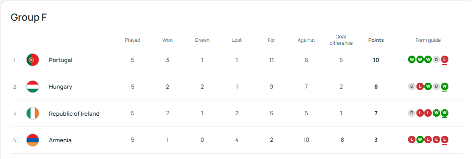 Natijada o‘yinning qolgan qismida hisob o‘zgarmay qoldi, irlandlarga qarshi qatorasiga ikkinchi o‘yinda ochkolardan mahrum bo‘lgan (Lissabondagi o‘yinda Ronaldu penaltini urolmagandi) Martines shogirdlari endi faqat so‘nggi turda, hech qanday motivatsiyasi yo‘q bo‘lgan armanlarga qarshi o‘yinda yo‘llanmani rasmiylashtirishi mumkin. Irlandiya esa o‘tish o‘yinlarida qatnashishi uchun safarda Vengriyani mag‘lub etishi kerak bo‘ladi.