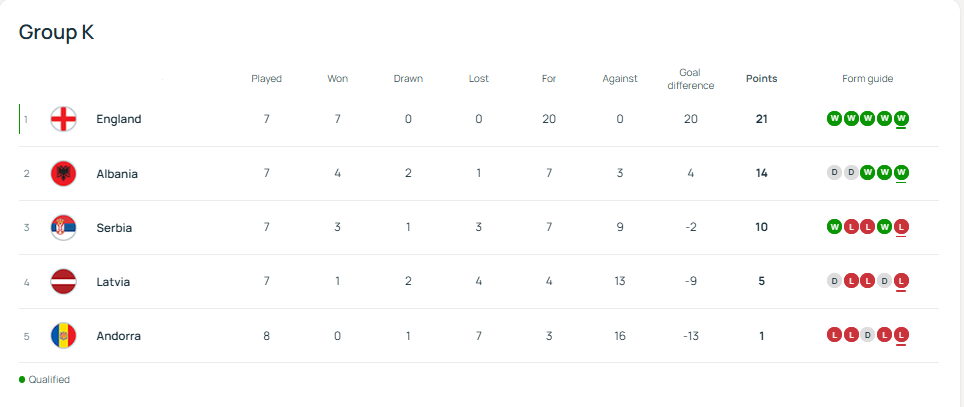 Muddatidan oldin yo‘llanmani hal qilib bo‘lgan Angliya JCh-2026 saralashi doirasidagi yettinchi o‘yinda ham g‘alabaga erishdi. Tomas Tuxel jamoasi Serbiyani ikkinchi o‘yinda ham mag‘lub etdi. 28-daqiqada Bukayo Saka standart vaziyat davomida amalga oshirilgan hujumni gol bilan yakunladi. Shundan keyin inglizlar o‘yinni nazorat qildi va katta kuch sarflamasdan himoyada o‘ynadi. Serbiya deyarli vaziyatlarga ega bo‘lmadi, o‘yin oxirida esa Pikford Kostichda yuzaga kelgan yagona vaziyatni ham bartaraf etdi. Qo‘shimcha daqiqalarda Eberechi Eze yakuniy hisobni o‘rnatdi – 2:0. Inglizlar saralashda yetti o‘yinda ham darvozasi daxlsizligini saqlab qoldi (20:0). Serblar esa bu mag‘lubiyatdan keyin ikkinchi o‘rindan umid uzishdi, ammo ularda Millatlar ligasi orqali o‘tish o‘yinlariga o‘tish imkoniyati bo‘ladi, buning uchun jahon chempionatiga yo‘llanma ololmagan jamoalar orasida kuchli to‘rtlikka kirish talab etiladi.