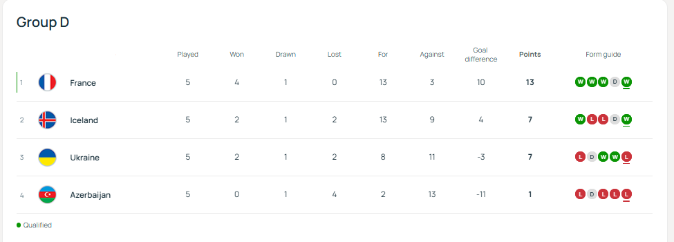 76-daqiqada esa «Bavariya» vingerining o‘zi pressing orqali boshlangan tezkor hujumni gol bilan yakunladi. Ko‘p o‘tmay Mbappe dublni rasmiylashtirdi. Bu 26 yoshli futbolchining faoliyatidagi 400-gol bo‘ldi. Yakuniy hisob 88-daqiqada Ugo Ekitike tomonidan o‘rnatildi. 4:0 – fransuzlar muddatidan oldin yo‘llanmani hal qildi. Ukraina endi o‘tish o‘yinlarida qatnashish uchun Islandiyani mag‘lub etishi kerak bo‘ladi, so‘nggi turda islandlarni ikkinchi o‘rinni o‘zida saqlab qolish uchun durang hisob ham qoniqtiradi.