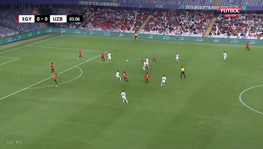 O‘yinda hisob ochilganidan so‘ng, 10-15 daqiqa, to O‘runov to‘sinni nishonga olishigacha Misr jiddiy faollik ko‘rsatib, raqibni deyarli jarima maydoniga qamab qo‘ydi. Endi yuqoridagi kontr-pressingga e’tibor bering. Terma jamoamizning 9 futbolchisi raqib jarima maydoni yaqinida – to‘p yo‘qotilgach, tezda uni qaytarib olishga harakat qildik va uddaladik. Ya’ni kuchli raqibga qarshi bo‘lsa-da, undan qo‘rqish, butun jamoa bo‘lib yotib olish o‘rniga, biz o‘z uslubimizni qo‘yishga, biz ham kichik jamoa emasligimizni ko‘rsatishga muvaffaq bo‘lyapmiz. Mana shunday vaziyatlardan so‘ng Misrdagi o‘ziga bo‘lgan ishonch, yengillik yo‘qoldi.