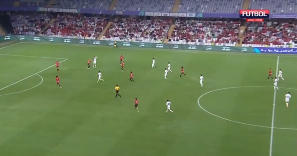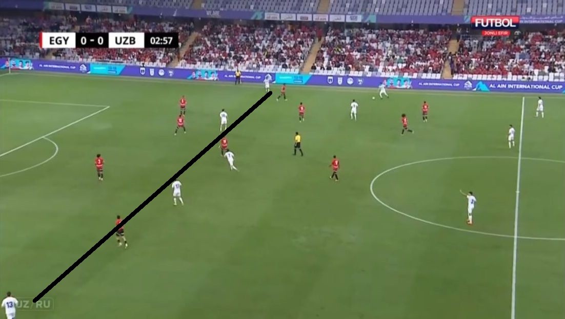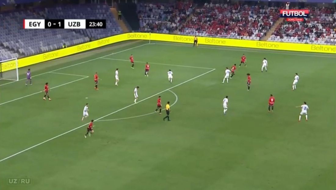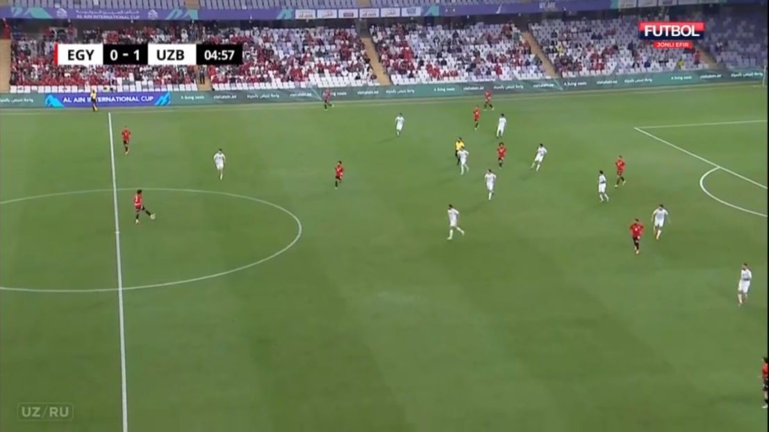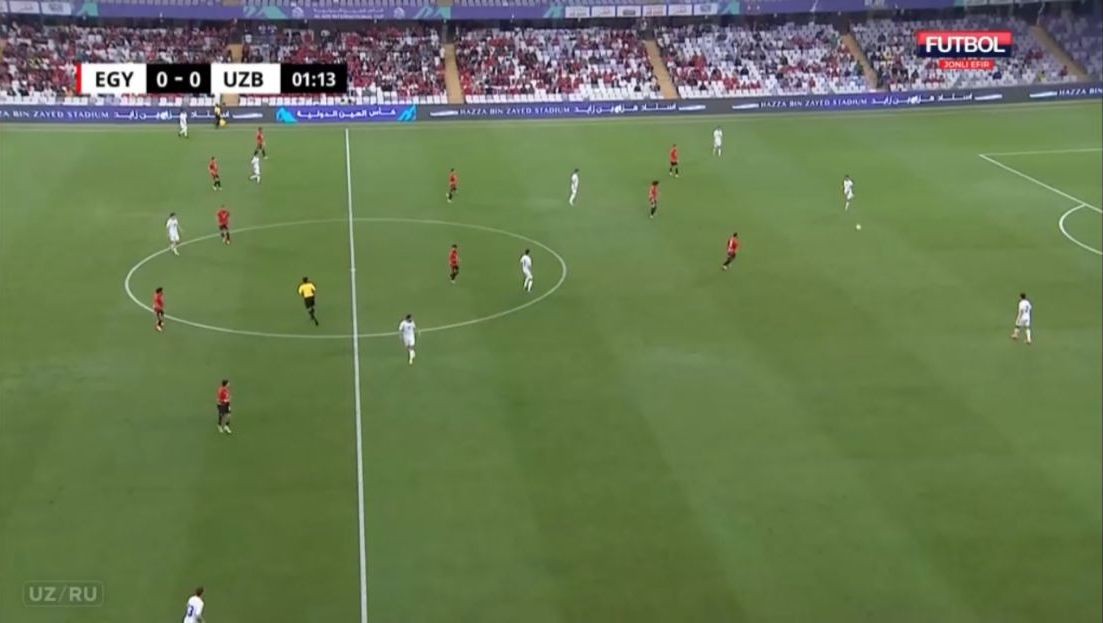 Misr aksariyat vaziyatlarda 5-2-3 sxemasida pressing qilishga urindi va uch hujumchi bizning uch markaziy himoyachimizga qarshi o‘ynadi. Bu holatda bizda O‘runov yoki G‘aniyev markazga tushib, raqibga nisbatan (3 ga 2) son jihatdan ustunlikni yaratishdi. Misr himoyachilaridan biri ham oldinga chiqib, tenglikka uringanda esa Shomurodov ham qo‘shildi. Bu qisqarishlar natijasida ko‘pincha qanotlarda biz hujum qilishimiz uchun bo‘shliqlar yuzaga kela boshladi. Ya’ni 3-4-3 (yoki 3-5-2) raqibda personal pressing uchun doim noqulayliklar yaratadi, zonalar bo‘yicha himoyalanganda esa doim qanotlarda son jihatdan ustunlikni ta’minlash mumkin. Albatta, buning uchun qanot futbolchilaridan juda yuqori jismoniy tayyorgarlik talab qilinadi.