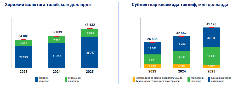 Yuridik shaxslar tomonidan chet el valutasiga bo‘lgan talab 2025 yilning dastlabki 10 oyida o‘tgan yilning mos davriga nisbatan 24 foizga o‘sgan bo‘lsa, ular tomonidan valuta taklifi hajmi 38 foizga oshgan. Xususan, eksport tushumlari hisobiga shakllanadigan valuta taklifi hajmi ushbu davrda 18 foizga oshib, 14,5 mlrd dollarga yetgan. Ushbu eksport tushumlarning 8,1 mlrd dollari yoki 56 foizi ichki valuta bozorida sotilgan (o‘tgan yilning mos davriga nisbatan 23 foizga yoki 6,6 mlrd dollarga ko‘p).
