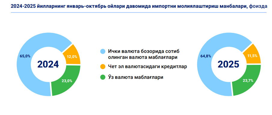 2025 yilning 10 oyida ichki valuta bozorida xorijiy valutaga bo‘lgan taklif hajmining o‘sishi talab hajmi o‘sishidan yuqori bo‘ldi. Xususan, hisobot davrida aholi banklarga sotib olganidan 7,8 mlrd dollar ko‘proq valuta sotdi. Bunda xorijdan pul o‘tkazmalari miqdorining sezilarli darajada oshgani asosiy omillardan biri bo‘ldi.
