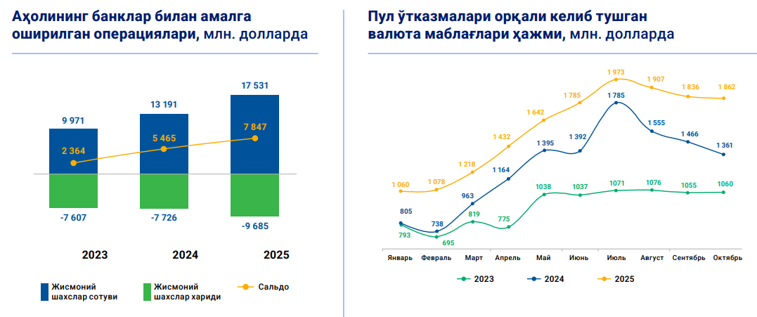 Jismoniy shaxslar banklarga 17,4 milliard dollar sotdi — bu o‘tgan yilga (13,2 milliard) nisbatan 1,3 baravar ko‘p. Aholi tomonidan valuta sotib olish 24 foizga oshib, 9,6 milliard dollarga yetdi.