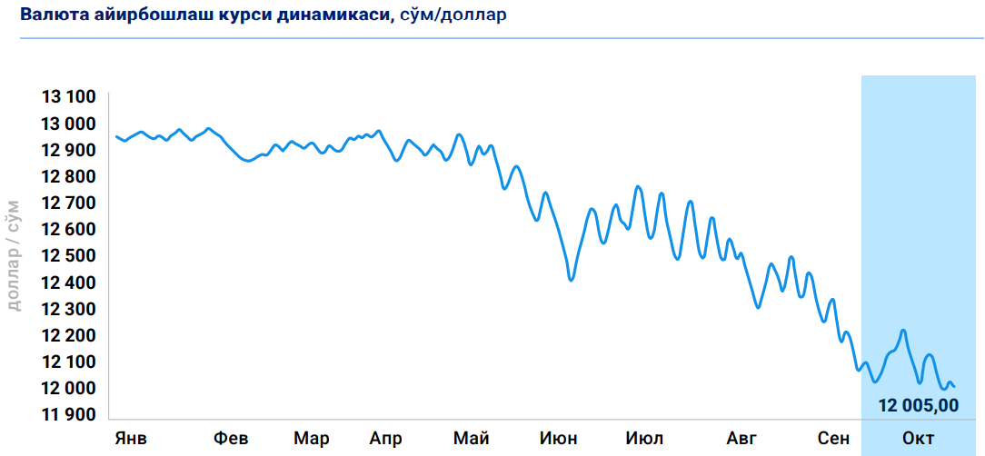 Milliy valuta ayirboshlash kursida mustahkamlanish tendensiyasi davom etib, yanvar-oktyabr oylari davomida uning qadri 7 foizga oshgan.