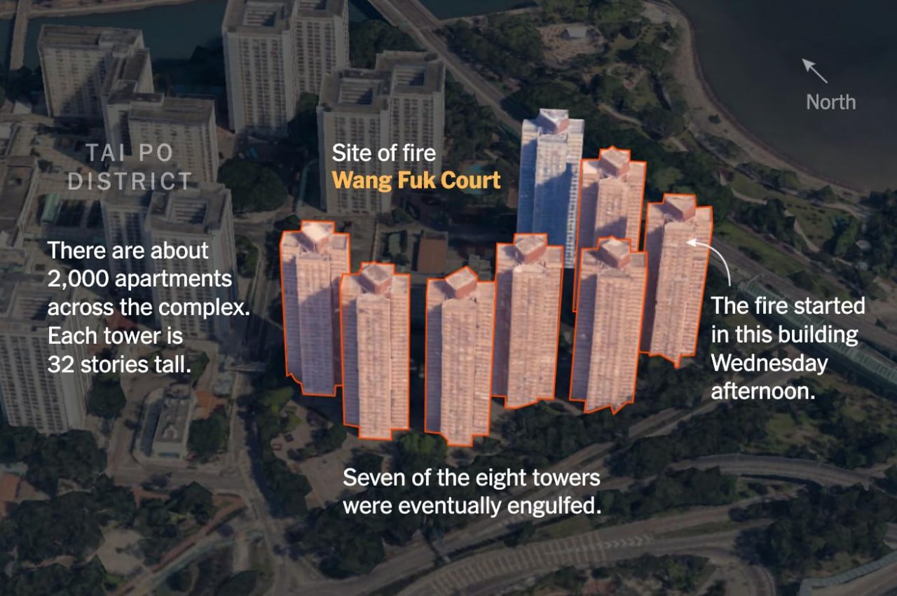 Hongkong shimolidagi 32 qavatli binolarda kelib chiqqan yong‘in 24 soatdan keyin ham to‘liq jilovlanmadi: kuchli alanga qutqaruvchilar ishini qiyinlashtirmoqda. Qurbonlar soni 65 kishiga yetdi, yana yuzlab insonlar bilan aloqa yo‘qolgan. Hukumat maxsus yordam fondini ochdi, majmuani ta’mirlayotgan kompaniyaning 3 nafar rasmiysi hibsga olingan.
