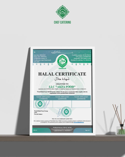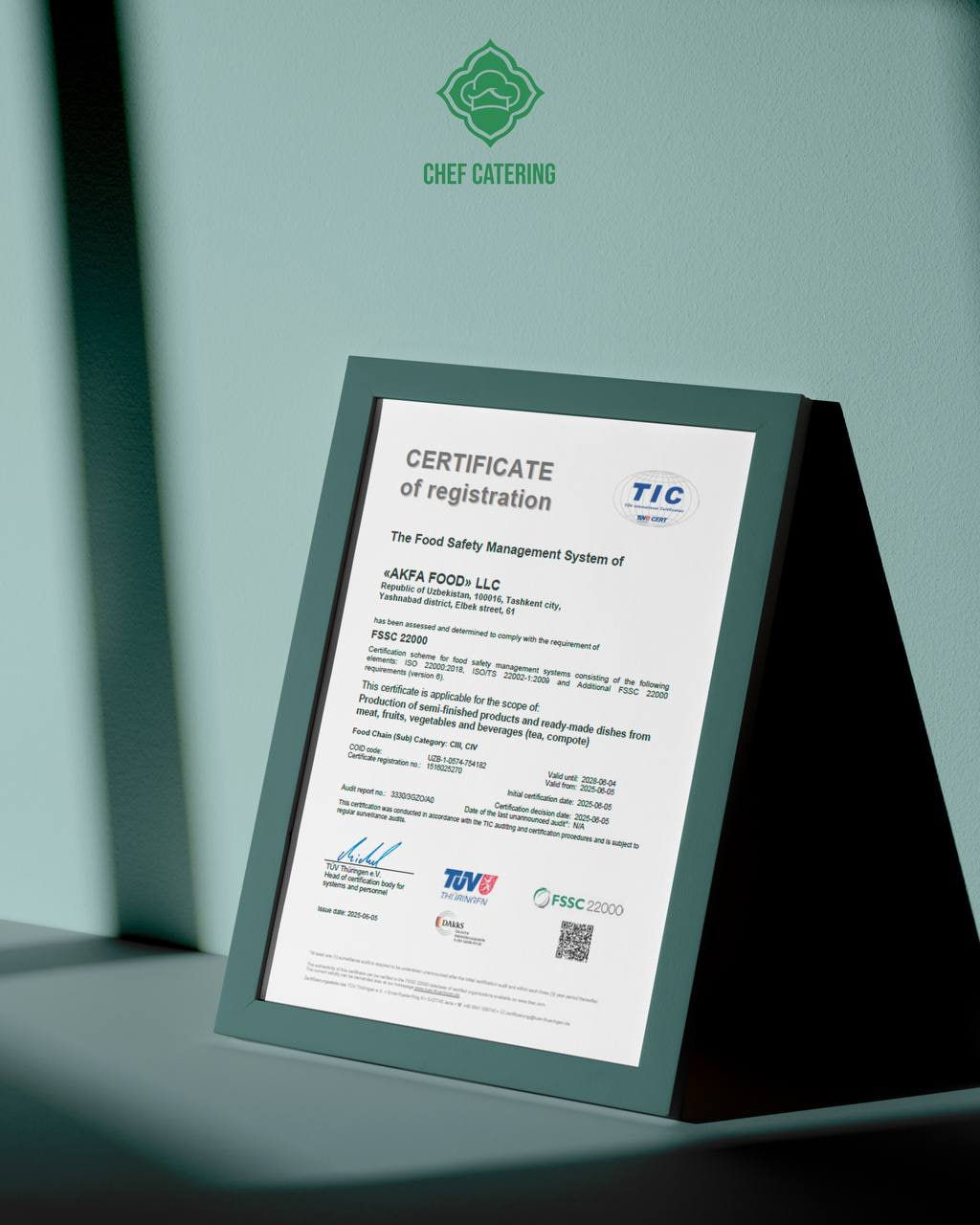 Xususan, Chef Catering O‘zbekistonda birinchi va hozircha yagona Halol sertifikatiga ega bo‘lgan keytering kompaniyasi hisoblanadi. Ushbu sertifikat diniy talablarga moslikni, ovqat pishirish jarayonlarining gigiyena, etik me’yorlar va shaffoflikka to‘liq mosligini tasdiqlaydi. Bundan tashqari, kompaniya xalqaro darajadagi FSSC 22000 (Food Safety System Certification) sertifikatiga ham ega bo‘lib, bu esa ovqat xavfsizligining yuqori standartlariga javob berayotganini anglatadi.