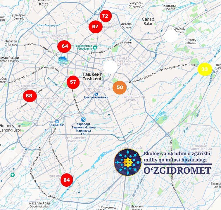 - RM2,5 mayda dispersli zarrachalar miqdori – 64 mkg/m³, bu esa ruxsat etilgan me’yordan (60 mkg/m³) 1,1 marta oshgan.