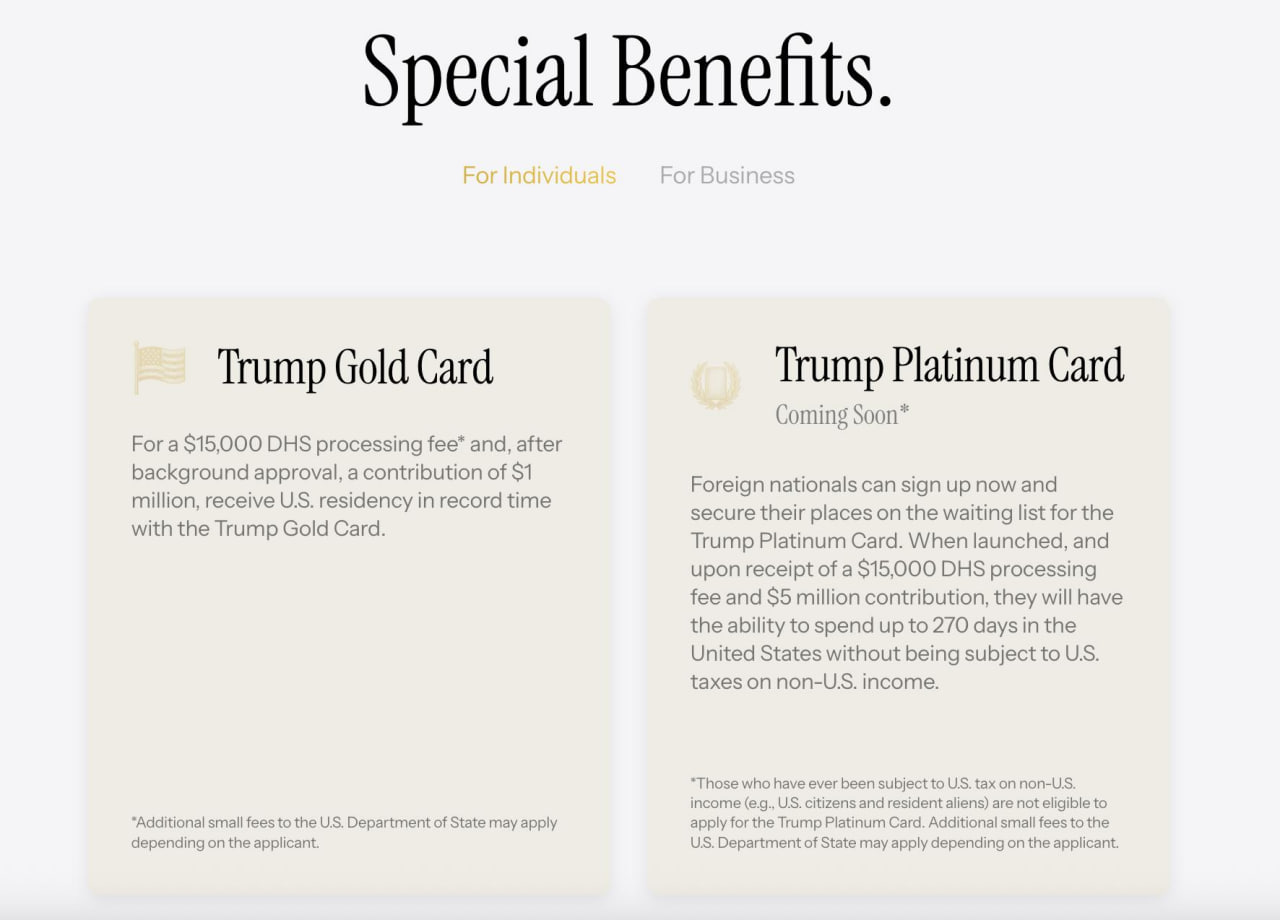 10 dekabr kuni AQSh prezidenti Donald Tramp uzoq vaqtdan beri va’da qilib kelgan «Trump Gold Card» – «Oltin karta» viza dasturini rasman ishga tushirdi. Ushbu karta 1 million dollar to‘lagan shaxslarga va har bir chet ellik xodim uchun 2 million dollar to‘lagan korporatsiyalarga AQShda qonuniy maqom, keyinchalik fuqarolik olish yo‘lini taklif qiladi.