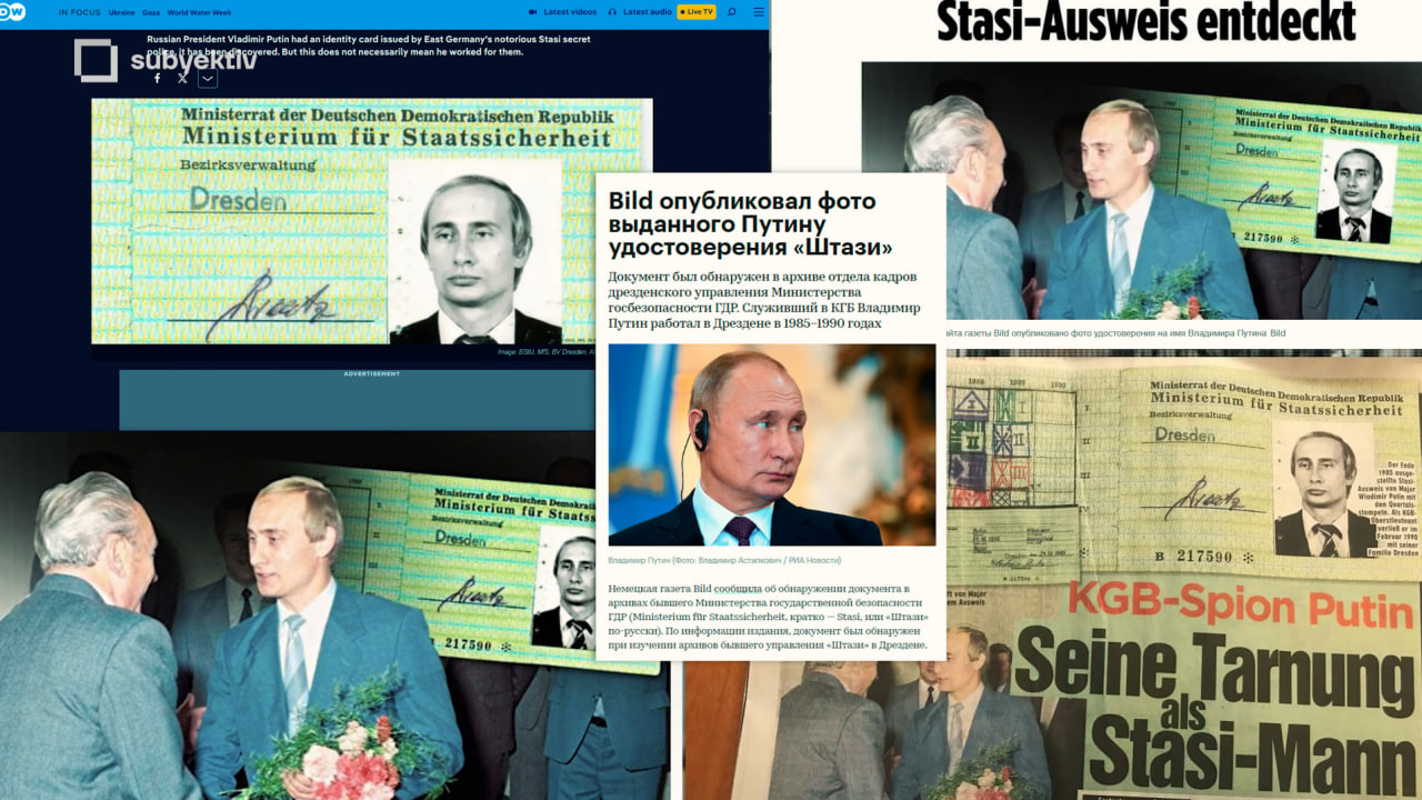 Putin 80-yillarda GDRning Drezden shahrida SSSR Davlat xavfsizlik qo‘mitasi (KGB) ofitseri sifatida faoliyat yuritgan. O‘sha paytlarda KGB va Shtazi G‘arbiy Germaniya bilan NATOga qarshi razvedka, agentlar jalb qilish, axborot yig‘ish ishlarini birgalikda olib borishgan. Putin ham bu jarayonda ishtirok etgani ochiq manbalarda keltiriladi. Guvohnoma unga Drezdendagi Shtazi idoralariga erkin kirish huquqini bergan.