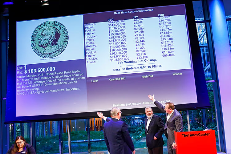 Rossiyada so‘z erkinligini himoya qilishdagi sa’y-harakatlari uchun 2021 yilda filippinlik Mariya Ressa bilan birgalikda tinchlik bo‘yicha Nobel mukofotini qo‘lga kiritgan rossiyalik jurnalist Dmitriy Muratov 2022 yil iyun oyida kimoshdi savdosida medalini rekord darajadagi 103,5 million dollarga sotdi.