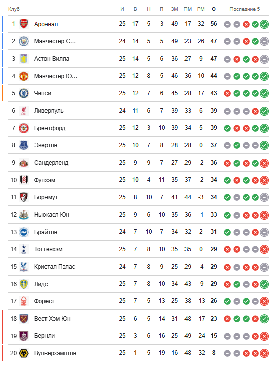 Ketma-ket ikkinchi o‘yindagi yirik g‘alabadan keyin Arteta shogirdlari turnir jadvalidagi birinchi o‘rinni mustahkamlab oldi. «Arsenal» 2003/04 yillar mavsumidan buyon ilk bor o‘yin kunini ikkinchi o‘rindan 9 ochkolik farq bilan yakunlashga erishdi. Bugun «Siti» «Liverpul»ga qarshi safar o‘yinida yutqazadigan bo‘lsa, ikkinchi o‘rin bilan oradagi farq 9 ochkoligicha qoladi.